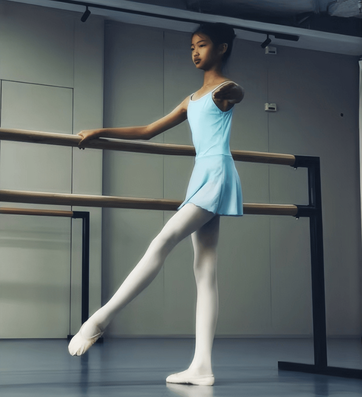 这次晒出的照片里,大半内容是小茉莉上舞蹈课的片段。今年刚满9岁的小茉莉,扎着干净的丸子头穿一身基础款舞蹈服,整个人又瘦又高,手长腿长的条件,一看就是学舞蹈的好苗子。